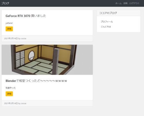 Djangoでとある動画を見ながらブログを作りました。 作ったブログサイト 1年前にも1度Djangoを勉強していたのですが、難しくて挫折しました。Flaskに逃げました。 MTVの理解がない...というよりも全くどこいじったらいいのか分からん、あっちこっち行き過ぎ…